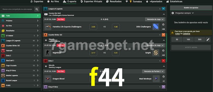 O f44 oferece uma grande seleção de opções de apostas em e-sports com probabilidades competitivas